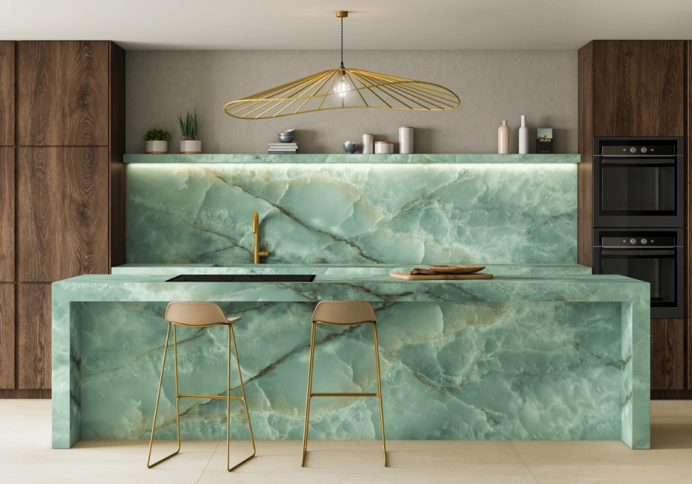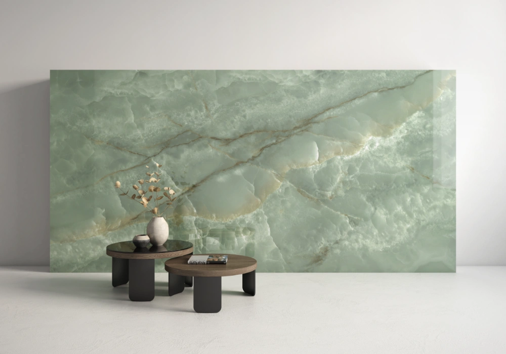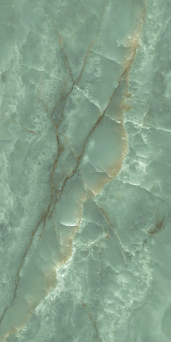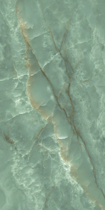 Onice Seagreen plytelė pasižymi švelnia, šviesiai žalsva spalva su giliomis, subtiliomis gyslomis, primenančiomis natūralų onikso akmenį. Plytelės paviršiuje matomi žaismingi šviesos atspindžiai ir tarsi rūku aptraukti tekstūros elementai sukuria prabangų ir paslaptingą įvaizdį. Rudos ir aukso atspalvių gyslos, prasiskverbiančios per jūros žalsvą foną, suteikia plytelei žavingą šešėlių ir švytėjimo žaismą, kuris pabrėžia jo gilų ir paslaptingą atspalvį.